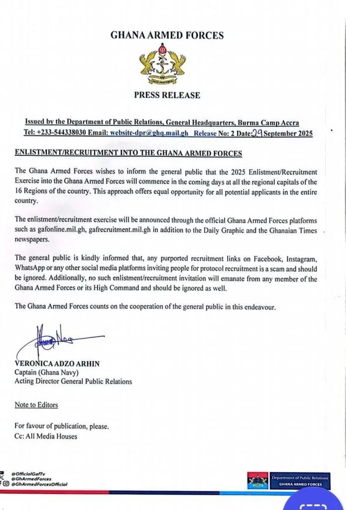 The statement clarified that official recruitment notices will be published exclusively on accredited platforms, including gafonline.mil.gh, gafrecruitment.mil.gh, and in state-owned newspapers such as the Daily Graphic and Ghanaian Time